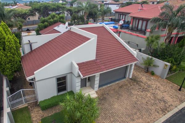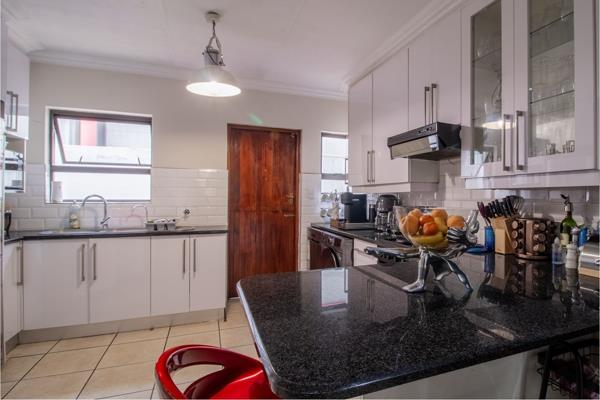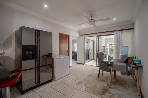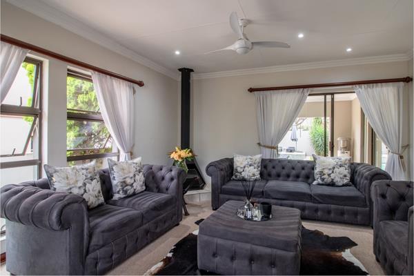 Flooded with natural light, the spacious lounge seamlessly connects to the covered patio, where a built-in braai provides the ideal setting for effortless entertaining. The patio overlooks a beautifully maintained garden and sparkling swimming pool, creating a tranquil outdoor retreat. The open-plan design extends into the dining area and a well-appointed kitchen with a breakfast counter, ensuring both functionality and sophistication.