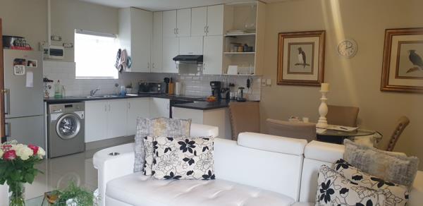 On entry wow what a lovely renovated unit with white openplan kitchen and space for all appliances and breakfast bar counter .