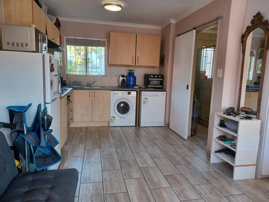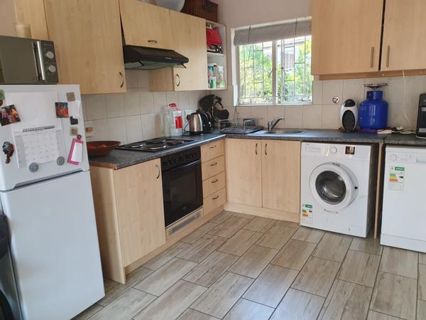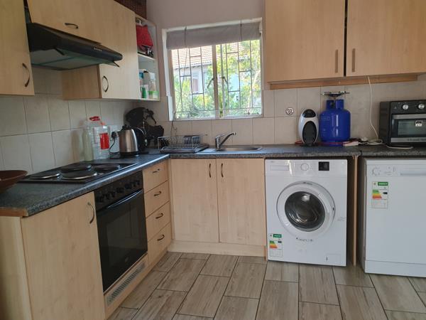 The kitchen is well equipped with ample cupboard space, double basin, space for a fridge and water appliance.