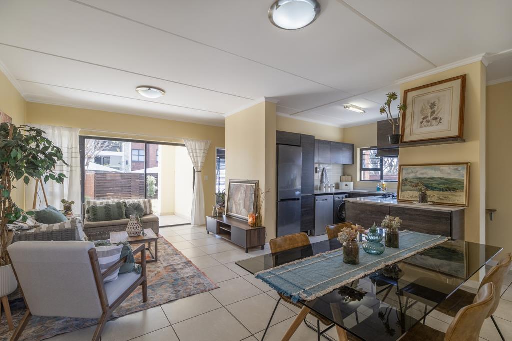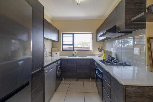 The heart of the home features an open-plan kitchen with space for a single-door fridge and three appliances: dishwasher, washing machine, and tumble dryer. The gas stove is perfect for home chefs and loadshedding-ready!