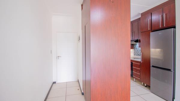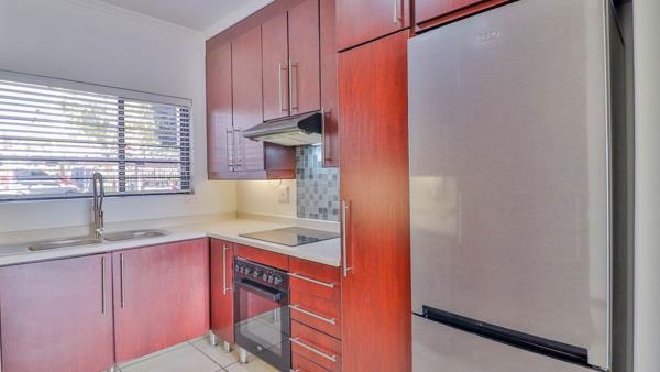 The interiors are crisp and modern, offering a flowing open-plan layout that connects the gourmet kitchen, complete with included fridge, dishwasher, and washing machine, to a welcoming lounge and dining area. Glass sliders open to a tranquil patio overlooking a private garden, ideal for lazy weekend braais or quiet morning coffees.