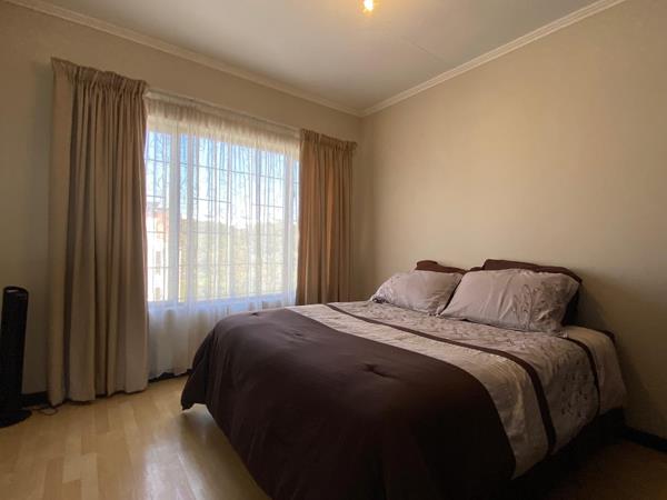 The kitchen has dark wood cupboards and white ceaserstone tops and space for all appliances