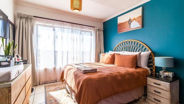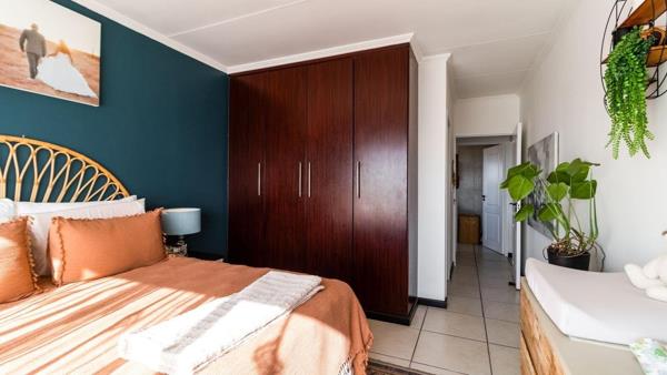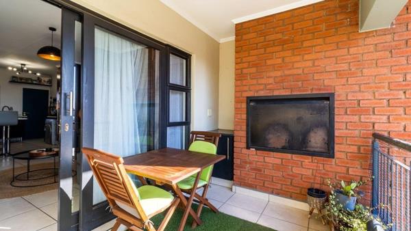 The unit features a spacious lounge that opens onto a covered patio with a built-in braai and handy storage. The kitchen includes a breakfast nook and plenty of cupboard space. There are two generously sized bedrooms and two bathrooms, with the main bedroom boasting an en-suite.