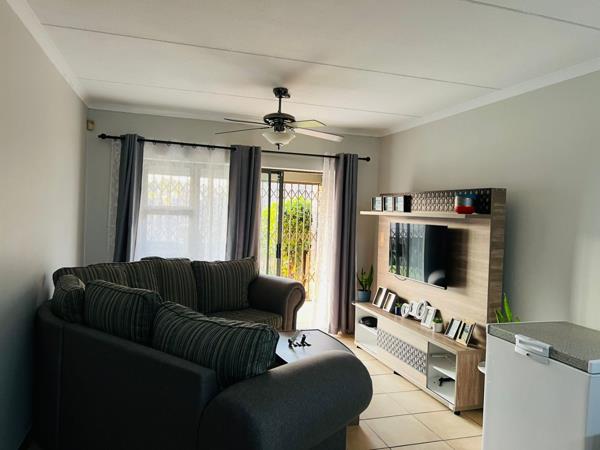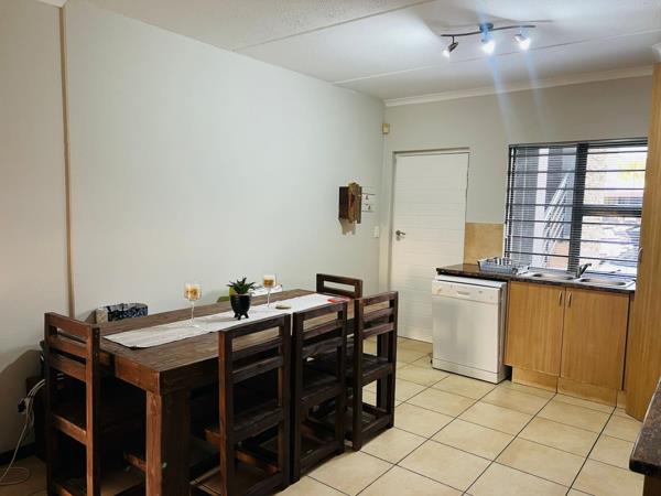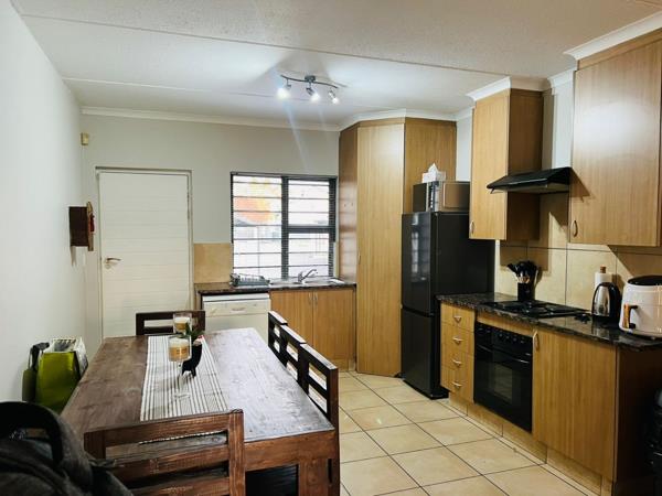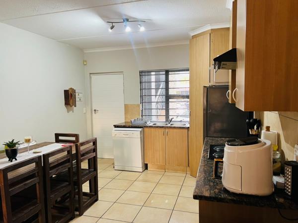 Step into a well-appointed kitchen featuring granite countertops, double sinks, a handy pantry, and space for a wet appliance. The open-plan lounge flows effortlessly onto a spacious and secure patio and private garden ideal for entertaining or simply unwinding while enjoying elevated views over Modderfontein Road and the estate surroundings.