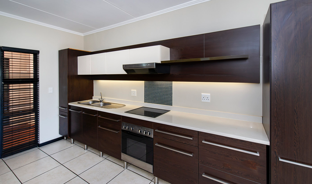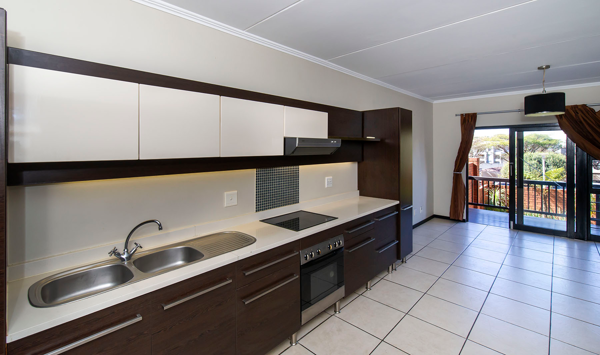 The galley kitchen comes with Caesarstone countertops, an electric stove, oven, and cooker hood, flowing effortlessly into the open-plan living area. The lounge opens via wooden sliding doors onto a wooden balcony, which leads to a private, landscaped garden perfect for kids to play or for family gatherings.