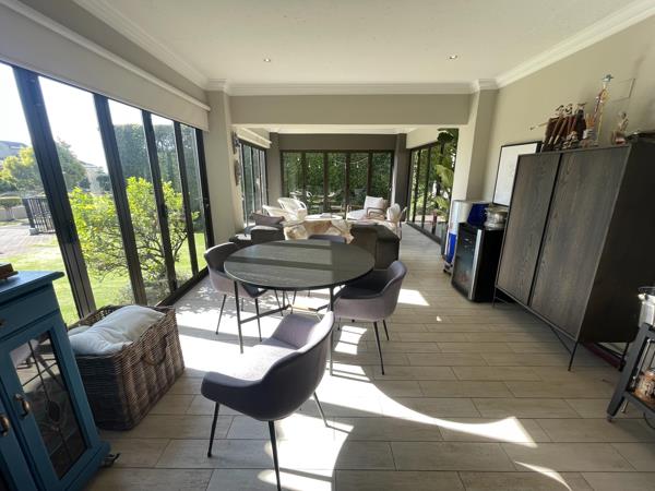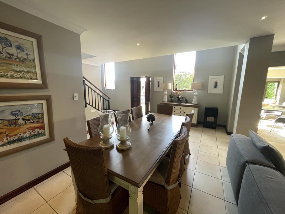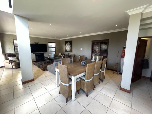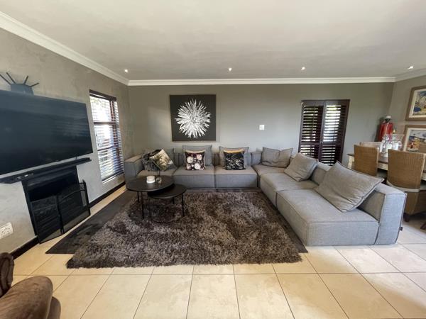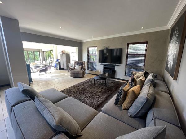 Step through the impressive double-volume entrance hall into expansive open-plan living areas that include a generous dining space, a cozy lounge, and a TV room with a gas fireplace creating a warm and inviting atmosphere. The modern kitchen features a gas hob, electric oven, scullery with space for three appliances, and direct access from the double garage. A second fireplace heats both levels of the home, adding to its charm and comfort. The downstairs area also includes a guest toilet and a stylish bar area that flows seamlessly onto a covered patio through stackable doors. The patio is an entertainers dream, complete with built-in charcoal and gas braais, as well as a state-of-the-art pizza oven, all overlooking the beautifully landscaped garden and decking area.