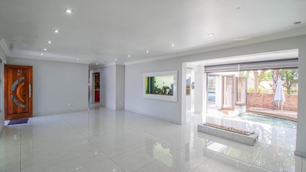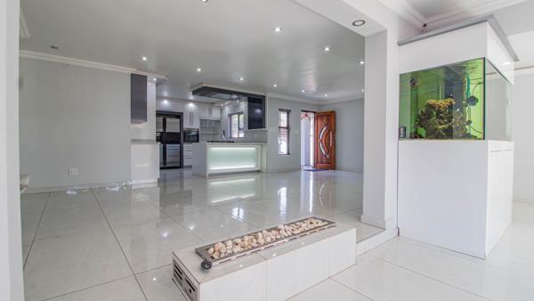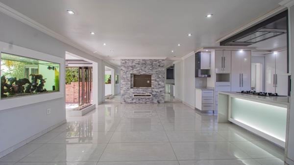 Inside, the open-plan living area is both elegant and inviting, boasting a sleek white kitchen with ample workspace, a central lounge with a gas fireplace and built-in fish tank, and a bar area perfect for entertaining. Stack-back doors create seamless indoor-outdoor flow, stepping down to the ultimate entertainment space: a sunken swimming pool surrounded by composite decking, a fire pit, and a built-in braai ideal for summer gatherings.