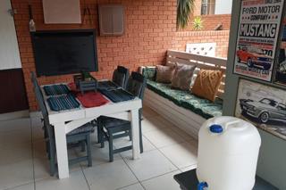 The open-plan kitchen is equipped with stone countertops, under-counter lighting, extensive cabinetry, and a full range of appliances, including a washing machine, tumble dryer, fridge/freezer, and dishwasher. The lounge area offers a cozy, furnished setting with leather couches and direct access to a covered patio that includes a built-in Jet-Master braai, storage cupboard, and stone countertopideal for entertaining or relaxing outdoors.