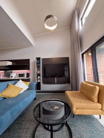 Double volume ceilings in both the lounge and bedroom! High end custom designed curtains with full block out remain! Modern lightfittings throughout! The kitchen, dining and lounge areas are open plan .... Both the bedroom and lounge open onto the balcony allowing loads of light to filter though this home.