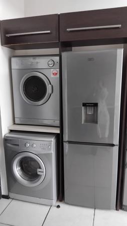 Kitchen has good cupboard space and includes all major kitchen appliances i.e. fridge, washing machine and tumble dryer. Both lounge and main bedroom have double volume ceilings creating light and space!