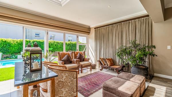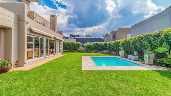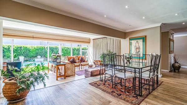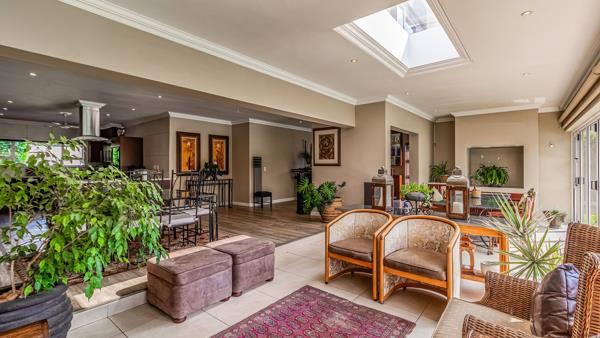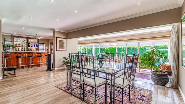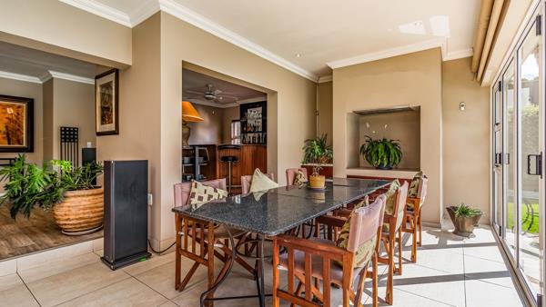 At the heart of the home, the open-plan kitchen flows beautifully into the informal lounge, enclosed patio, dining area, and stylish bar complete with a bar fridge. Designed with entertaining in mind, the space accommodates space for a built-in gas braai or fireplace, while stacker doors open out to an expansive garden and sparkling blue pool offering endless space for children and pets to enjoy.
