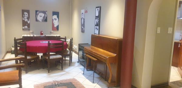The spacious, eat-in kitchen is perfect for preparing family meals and entertaining. It features granite countertops, a gas stove, a built-in microwave, and an oven, with a separate scullery for added convenience. The open-plan lounge and dining area provide a versatile space to bring family and friends together.