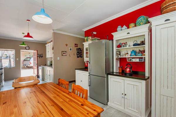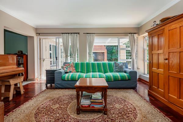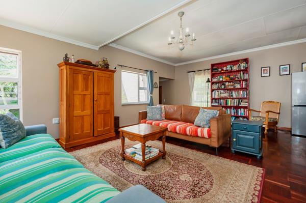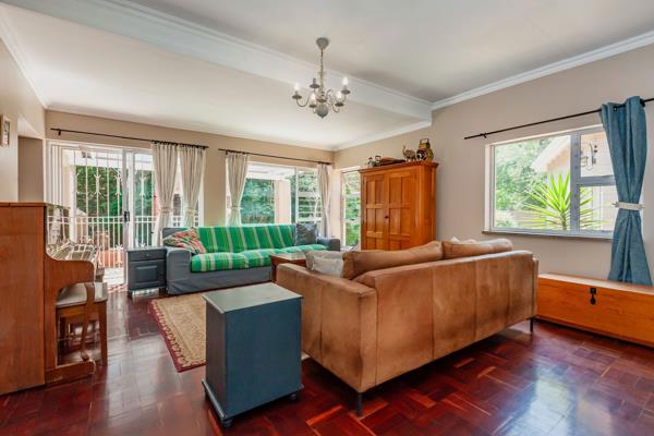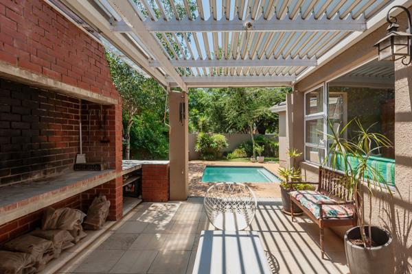 The home offers an inviting lounge area with timeless parquet floors, leading out to a covered braai area overlooking a glistening, solar heated pool.