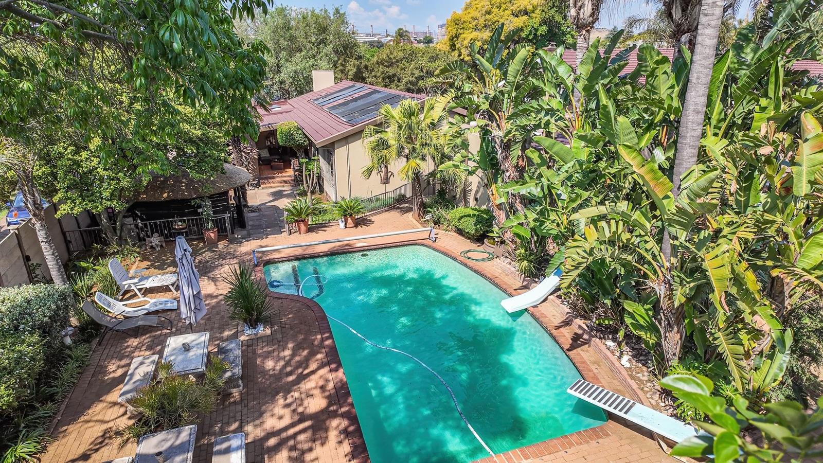 OUTSIDE from the covered patio looking onto the lush landscaped garden. A sparking pool , covered private jacuzzi and large lawn area for kids to play in. There are solar panels to heat the pool.