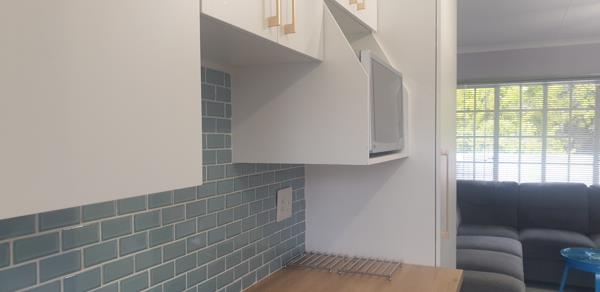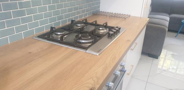 Abespoke kitchen with subwasy tiles in seagreaan and wood tops and white cabinets with all brass finishes and space for all appliances .