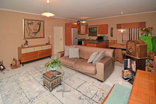 The lounge opens onto a large patio, overlooking a beautiful solar-heated swimming pool nestled in a lush, evergreen garden. The property also includes domestic quarters with a bathroom and three automated garages.
