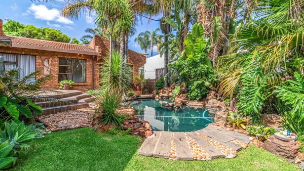 The lounge opens onto a large patio overlooking a solar-heated swimming pool and an established, evergreen garden, ideal for relaxed outdoor living and entertaining. The property also includes domestic quarters with a bathroom and three automated garages.