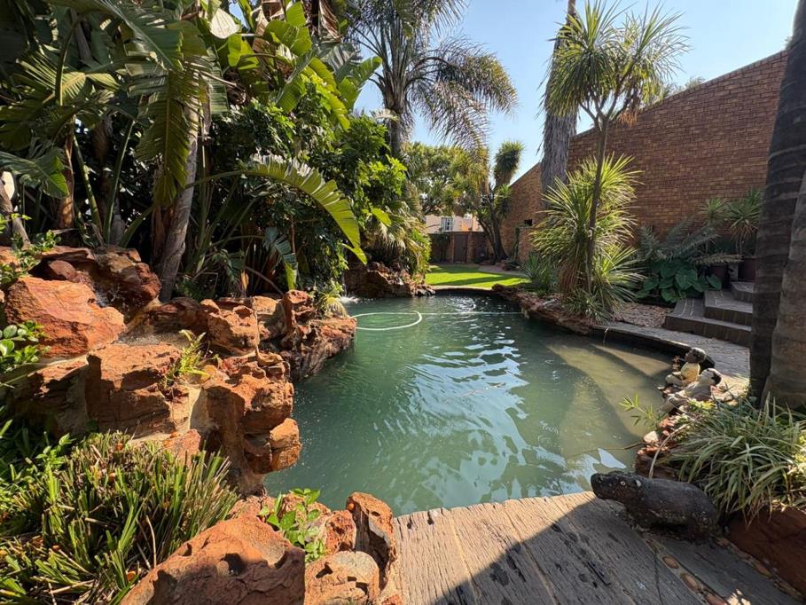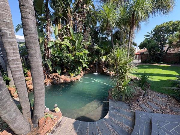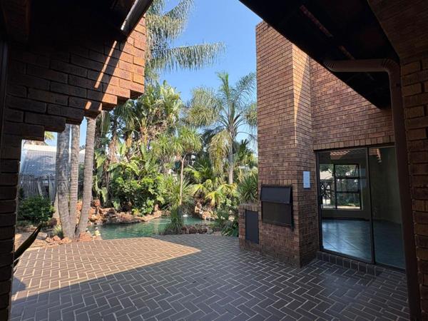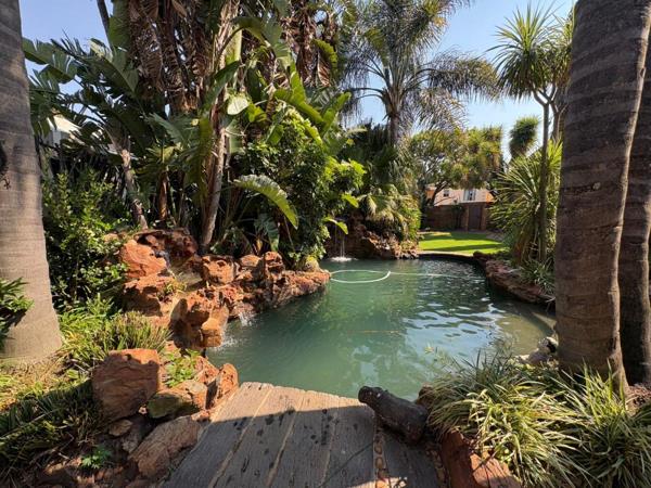 An impressive undercover entertainment patio opens onto a solar-heated swimming pool framed by natural rock features and towering palms. It feels like a private retreat perfect for summer gatherings or peaceful evenings at home.