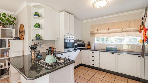 The tastefully designed kitchen features granite countertops, gas hob, ample cupboard space, and a separate scullery with space for dishwashing appliances. The scullery also offers direct access to a paved courtyard.