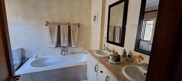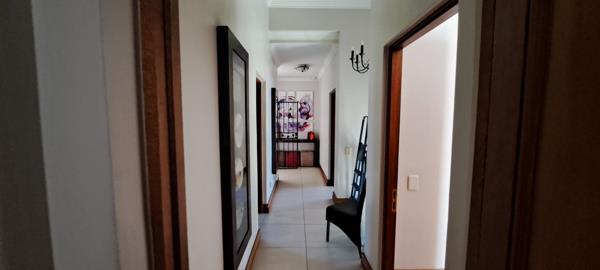 The home boasts a superb entertainment area complete with a built-in braai, overlooking a well-maintained garden and sparkling swimming pool, creating an ideal setting for hosting family and friends.
