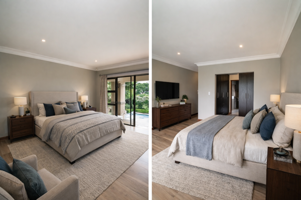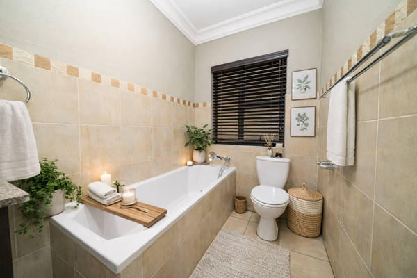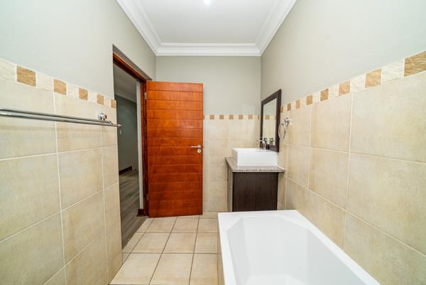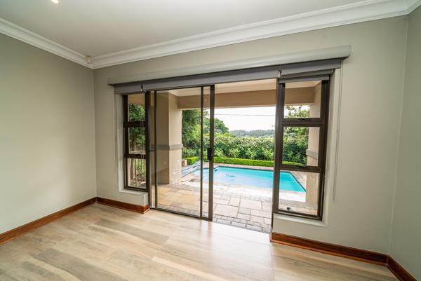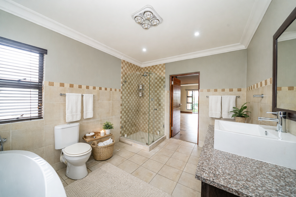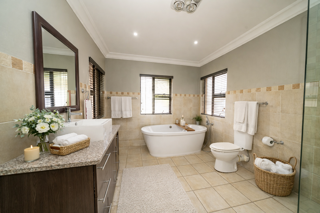 The main en-suite bedroom is a true retreat, featuring sliding doors that open onto a covered patio fitted with roll-down blinds, overlooking the swimming pool. This suite includes walk-in cupboards and a luxurious, fully tiled en-suite bathroom with a freestanding bath, shower, toilet, and vanity basin.