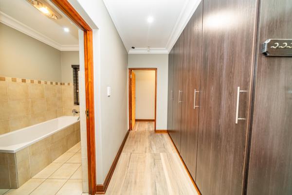 The home offers three spacious, modern bedrooms, all fitted with full built-in cupboards. The secondary bedrooms are serviced by a well-appointed full bathroom with a bath, toilet, and basin. A generously wide 1.5-metre passageway, complete with linen cupboards, adds to the homes sense of space and practicality.