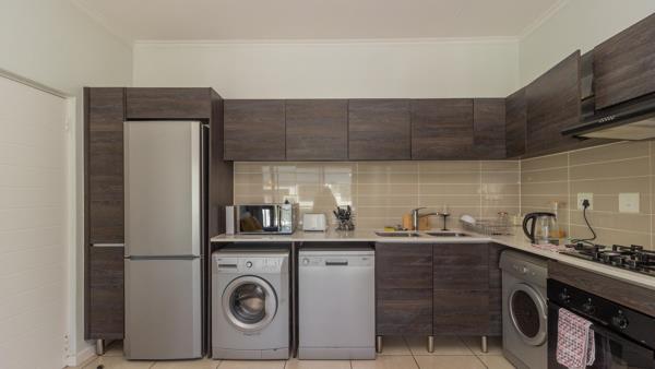 The modern, open plan kitchen is fitted with a stylish tiled backdrop and Caesar-stone tops, gas hob and is equipped with a Defy tumble dryer, dishwasher, washing machine and fridge.
