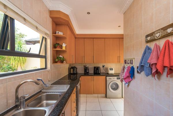The modern, separate kitchen features Rustenburg black granite tops, a gas hob, electric oven and extractor fan, along with a practical three-seater breakfast counter. A separate scullery provides under-counter space for three appliances as well as room for a double-door fridge. Downstairs also includes a generous study and a guest toilet for added convenience.