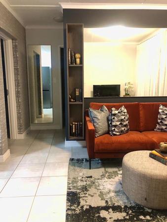 Carrying a modern feel throughout and featuring three bedrooms with built in cupboards and tiled flooring, two bathrooms with the main en suite, a stunning kitchen , space for undercounter appliances and a single door or double door fridge.