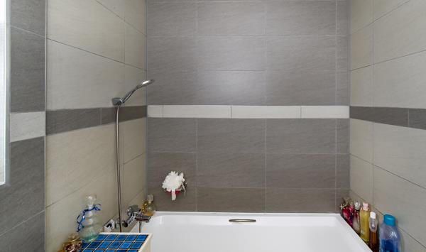 A modern bathroom featuring a shower-over-bath design.