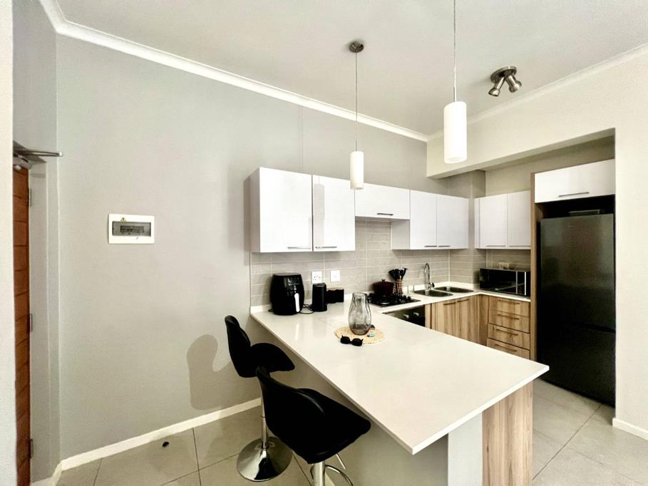The unit features contemporary finishes throughout, with an open-plan layout that seamlessly connects the lounge area to a state-of-the-art kitchen. Step outside onto the spacious balcony, complete with a built-in gas braai, perfect for entertaining or simply enjoying the stunning views of the complex.