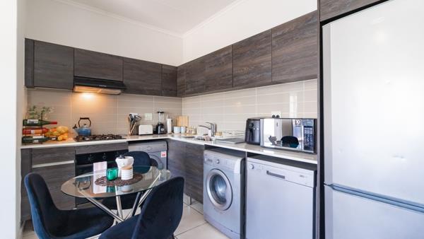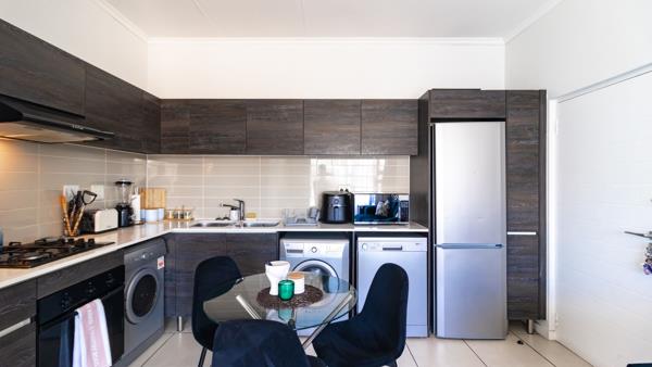 The kitchen is thoughtfully designed with modern appliances, including a gas hob, electric oven, dishwasher, fridge, washing machine and tumble dryer (all sold Voetstoots), combining style with practicality.