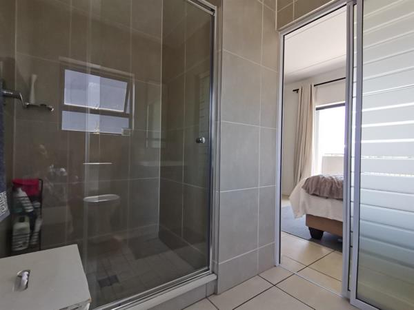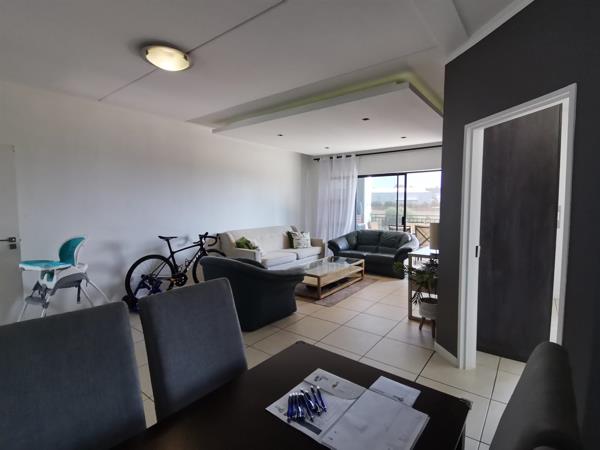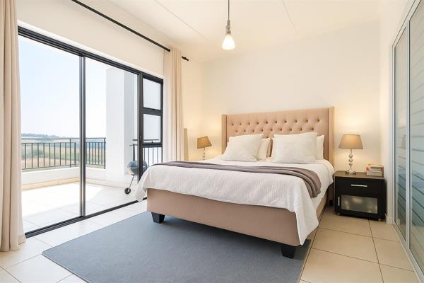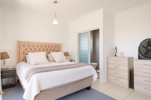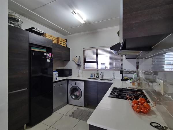 The sleek, open-plan kitchen features a Defy gas hob and four appliances, flowing effortlessly into a spacious lounge and dining area enhanced by elegant designer bulkhead ceilings. Step outside onto the large, covered balcony fitted with an all-weather blind where you can relax with a sundowner or entertain guests while taking in the tranquil outlook.
