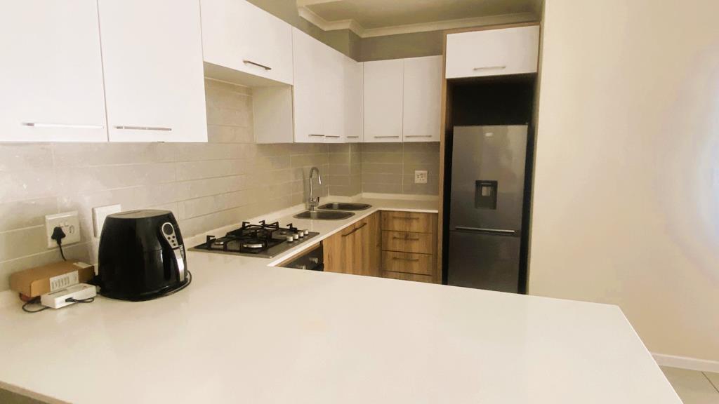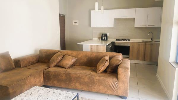 The home features an open-plan kitchen and living area, creating a bright, spacious environment ideal for relaxing or entertaining. Large windows invite plenty of natural light, while sleek fixtures and integrated appliances give the kitchen a clean, modern feel.