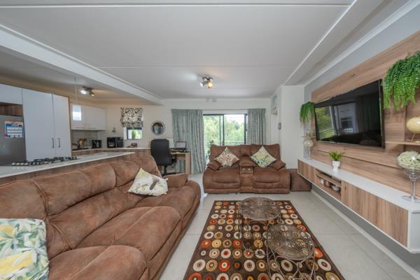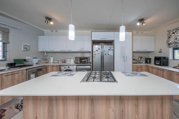 The home features a spacious open-plan layout with a gourmet kitchen, complete with a gas hob and space for three appliances. The bright lounge and dining area flow seamlessly onto a covered patio with a built-in gas braai, offering beautiful views of the Modderfontein Nature Reserve ideal for relaxed entertaining.