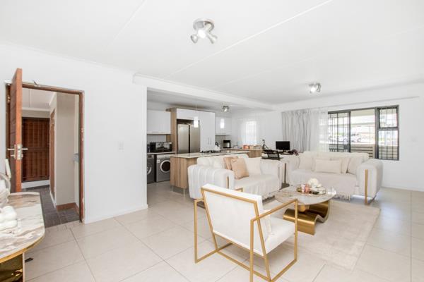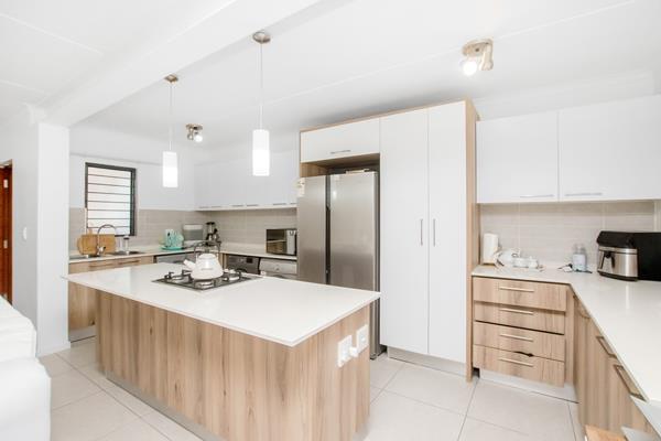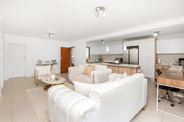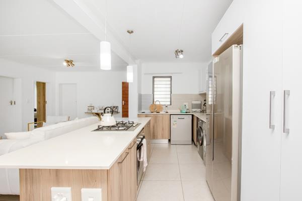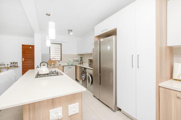 With large en suite bedroom, open plan living, kitchen island and ample cupboards in modern kitchen, large undercover patio with built in Gas Braai a fenced private garden - Sectional title ownership.