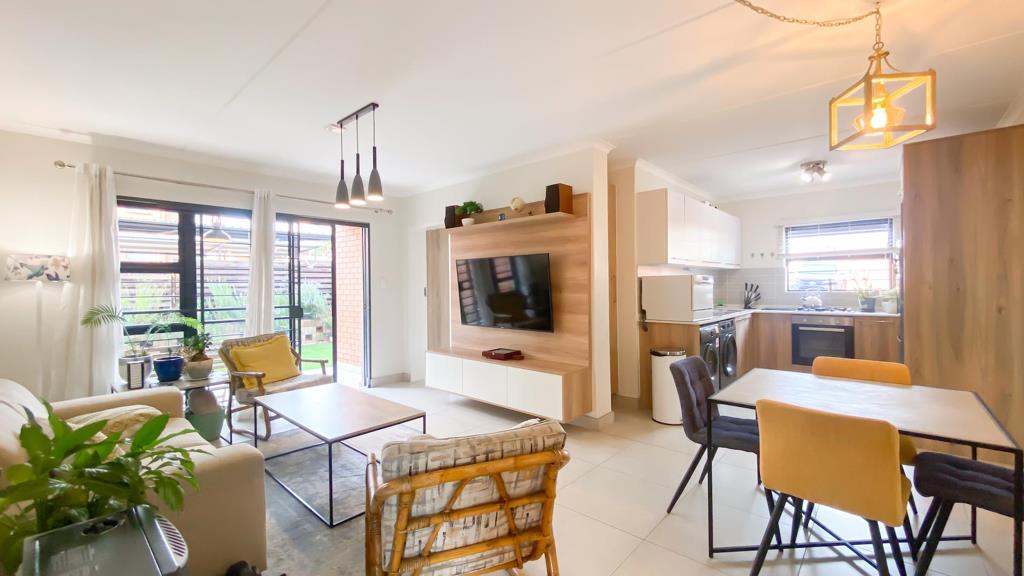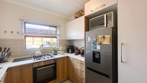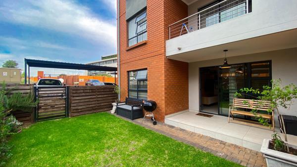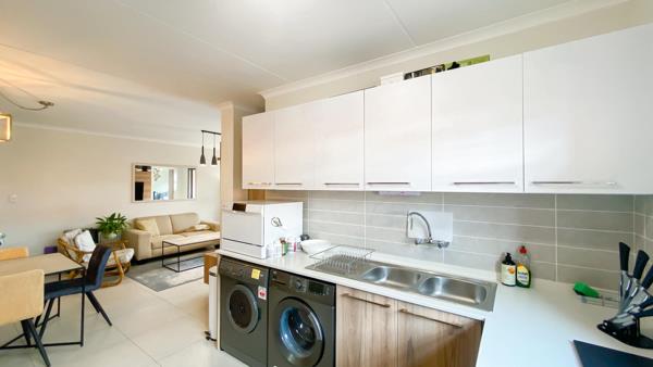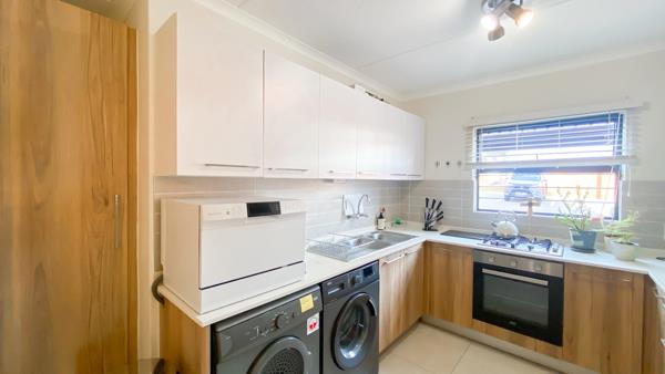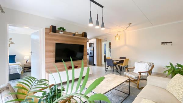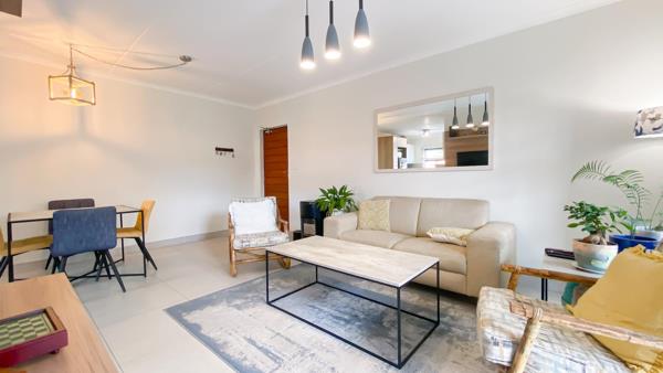 The light and bright open plan living area presents an open-plan lounge and dining room, and modern kitchen featuring Caesarstone tops, gas hob, and a combination of beautiful light wood and white cupboards. A sliding door leads to an exclusive covered patio and manicured, fenced garden. A bedroom en-suite is complimented by a bathroom with shower. There are an additional 2 bedrooms with BICs, and modern 2nd full bathroom.
