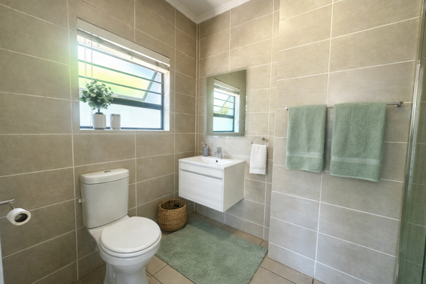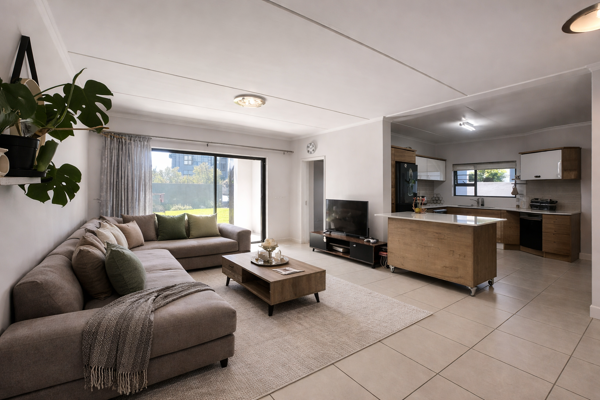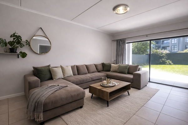 The open-plan kitchen is fitted with quality appliances, ample cupboard space, and flows seamlessly into the lounge and dining area. From here, sliding doors open onto a private garden, creating a natural indoor-outdoor flow that is perfect for entertaining or relaxing. This pet-friendly garden unit is a rare find within the estate.