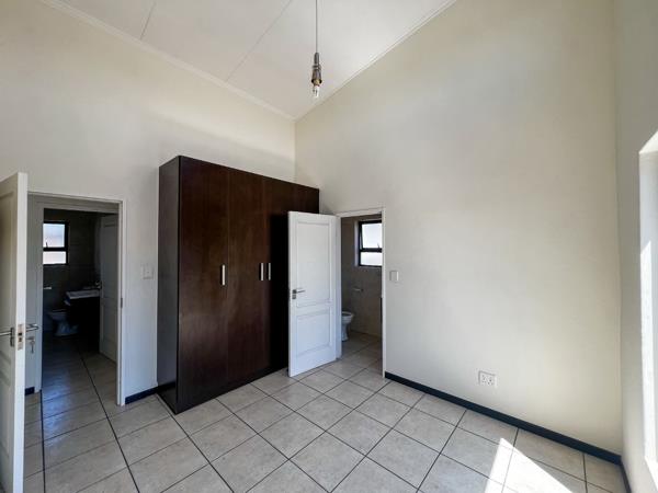 This elegant apartment offers a sophisticated blend of modern finishes and practical design within a highly secure, 24-hour manned complex. The main bedroom includes an en-suite bathroom, while the second bedroom is serviced by a full additional bathroom. Both bedrooms feature built-in cupboards, curtain rails, and stylish tiled flooring. The well-appointed kitchen is fitted with high-gloss cabinetry, a pantry, gas hob, oven, and a dishwasher connection, combining functionality with sleek contemporary appeal.
