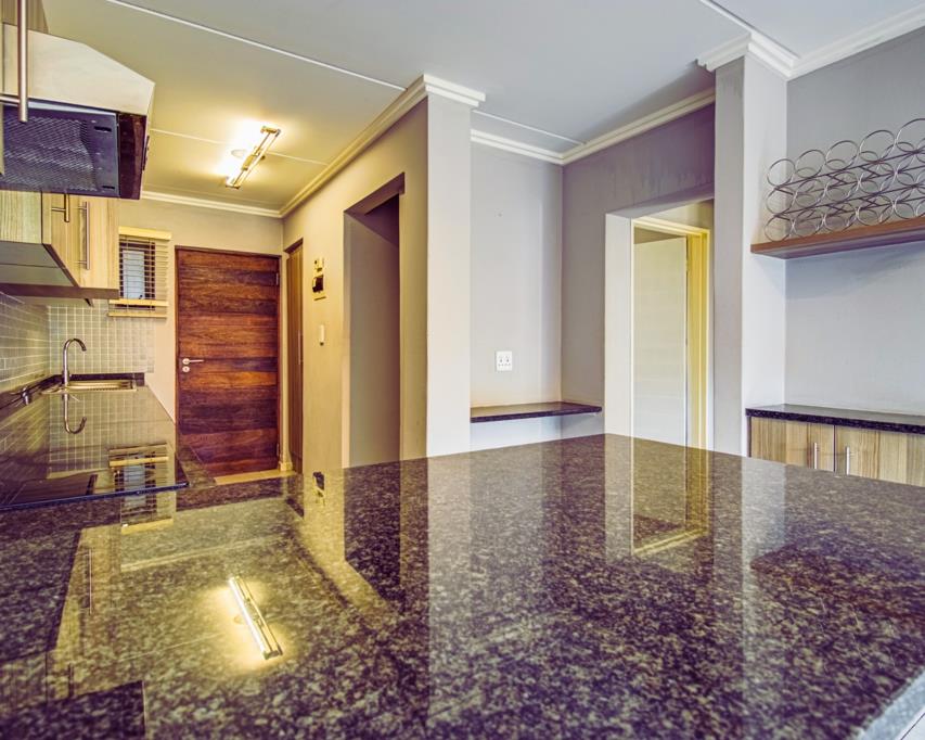 The open-plan layout is perfect for modern living, with a spacious kitchen featuring granite countertops, built-in cupboards, and high-end appliances. It seamlessly flows into the bright lounge area, creating an inviting space for both relaxation and entertaining.