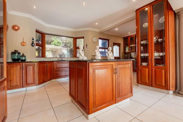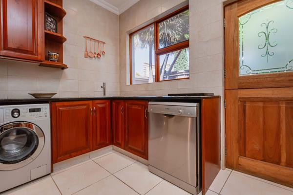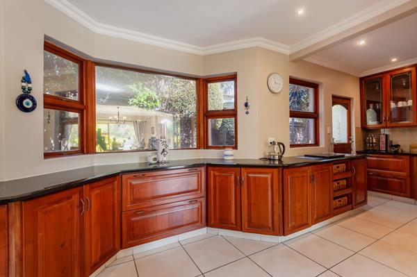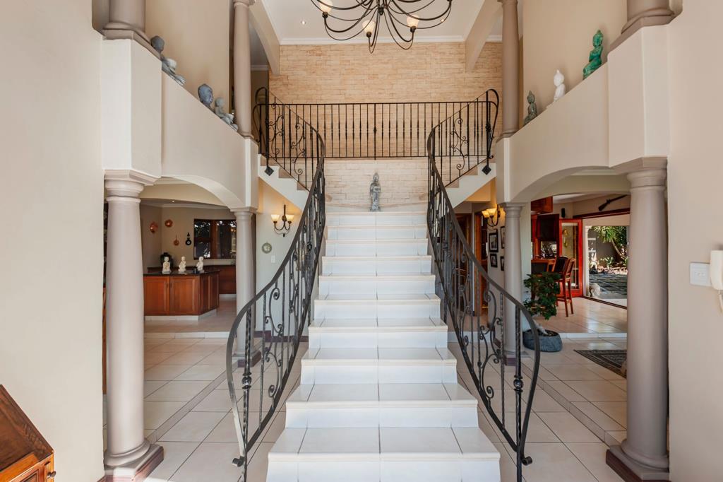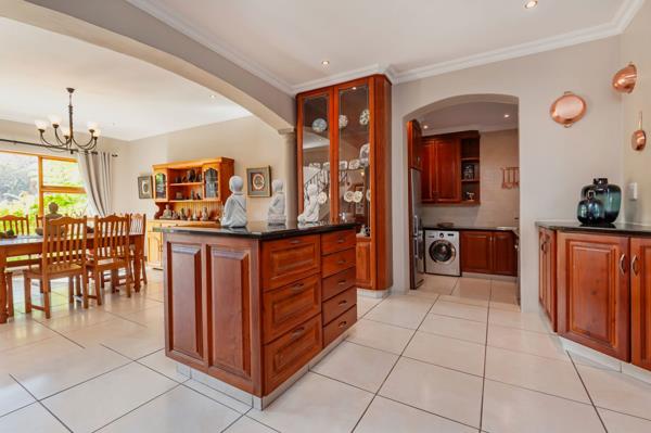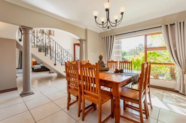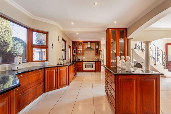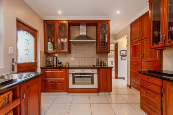 A striking, classic double-volume entrance hall with a sweeping staircase welcomes you into the home. The ground floor features spacious living and dining areas ideal for relaxed family life or entertaining guests. Adjacent, a dedicated entertainment room with a built-in rosewood bar opens via stacking doors onto a covered patio, creating seamless indoor-outdoor flow for year-round gatherings, from hosting a braai to enjoying a quiet afternoon. The kitchen, fitted with custom rosewood cupboards, granite countertops, and a practical scullery, makes daily routines effortless.