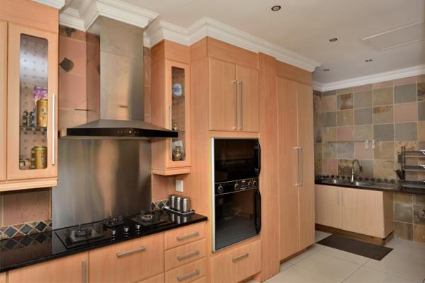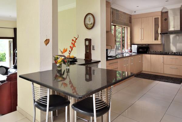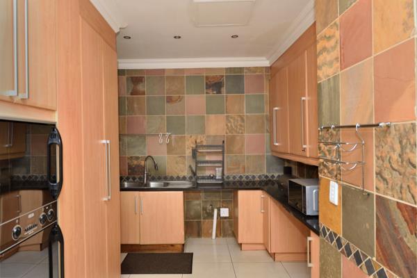 From the moment you enter, youre welcomed by porcelain tiled flooring throughout. The ground floor features a modern open-plan kitchen with sleek granite countertops, a gas hob, electric oven, extractor fan, and a central breakfast counter. A separate scullery area accommodates three undercounter appliances, adding to the homes practicality. The kitchen opens onto a bright and sunny lounge, which in turn leads to a covered patio complete with built-in braaian ideal space for relaxed entertaining while enjoying views of the sparkling heated pool and the expansive private garden.