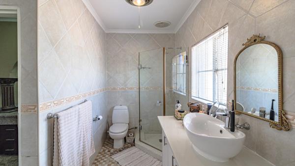 Outdoors, the home truly excels. The expansive entertainment area is fully tiled and features a built-in braai and stylish bar ideal for hosting on any scale. A sparkling swimming pool and a private steam room with shower elevate the property into a personal wellness sanctuary.