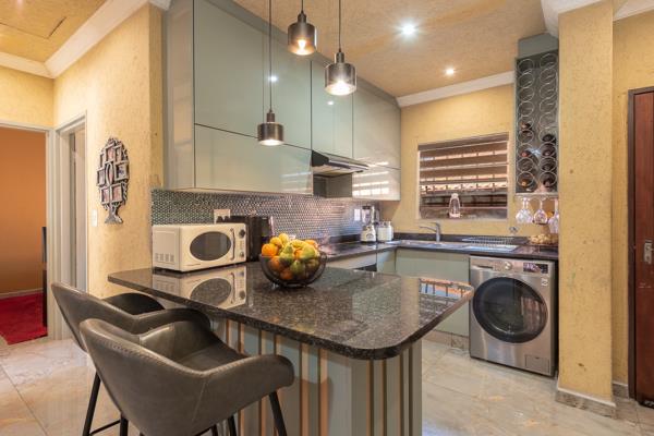 The kitchen is a chef''s dream, boasting modern tiles, sleek finishes, an abundance of cupboard space with high-gloss olive-coloured doors reaching the ceiling, granite countertops, a 3-seater eating nook, a glass-top electric hob, an under-counter electric oven, an extractor fan, a wine rack, a modern splashback, and dedicated space for a dishwasher/washing machine and fridge/freezer, complete with a pantry and broom cupboard.