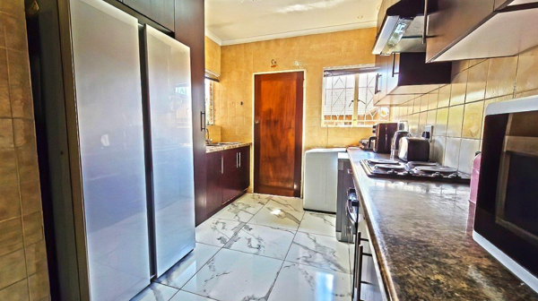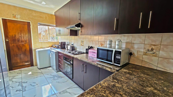 A beautifully finished kitchen with ample cupboard and appliance space,