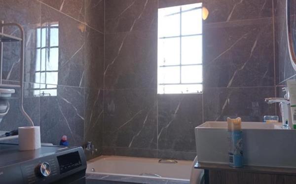 The apartment comprises two well-proportioned bedrooms and a single, modern bathroom. The bathroom is appointed with sleek dark marbled wall tiles, a bathtub, and a contemporary square basin. For added convenience, a washing machine is integrated into the space, and two windows provide natural light and ventilation, though fitted with security bars.