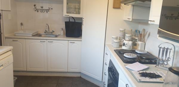 The open plan kitchen has granite tops, a gas stove, plenty of cupboards and space for appliances.