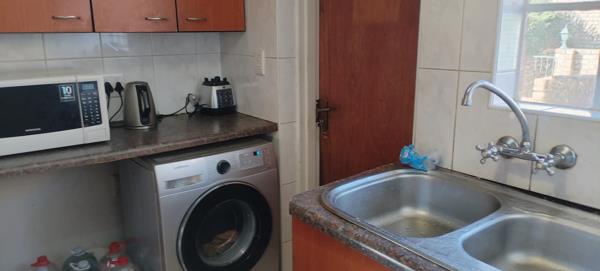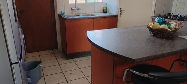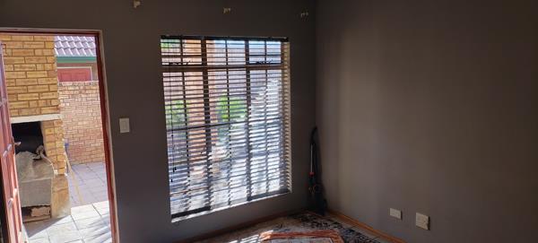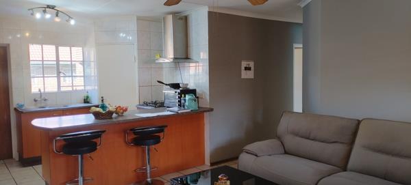 The open-plan kitchen offers enough cupboard space, a pantry, a gas hob, an electric oven, and dedicated space for a front-loader washing machine. This leads to an open-plan lounge with access to a front patio, complete with a built-in braai, a garden, and a pool. Additionally, there is a second lounge or TV/family room.
