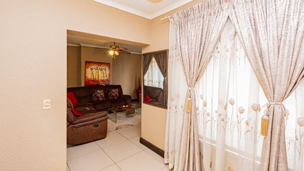 Step inside to discover a well-appointed interior designed for comfortable living. The spacious lounge, featuring modern tiled flooring, crown molding, and a ceiling fan, provides an inviting space for relaxation and entertainment. Adjacent to this, a dedicated dining room offers an ideal setting for family meals. The functional kitchen is ready to cater to your culinary needs, completing the heart of the home.