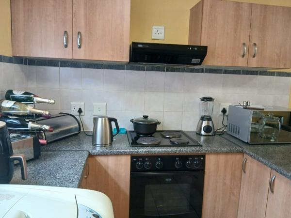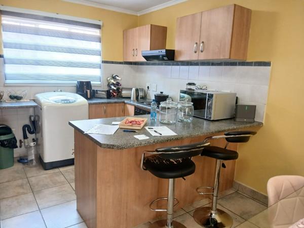 Step inside this inviting 152 sqm residence to discover a bright, open-plan living and dining area, bathed in natural light from large sliding doors. The space features durable tiled flooring and neutral walls, providing a versatile canvas for personal style. The functional kitchen boasts wood-grain cabinetry, ample granite-style countertop space, a tiled backsplash, and includes a built-in electric hob, oven, and extractor fan. A convenient breakfast bar offers additional seating, while the layout ensures seamless flow for entertaining.